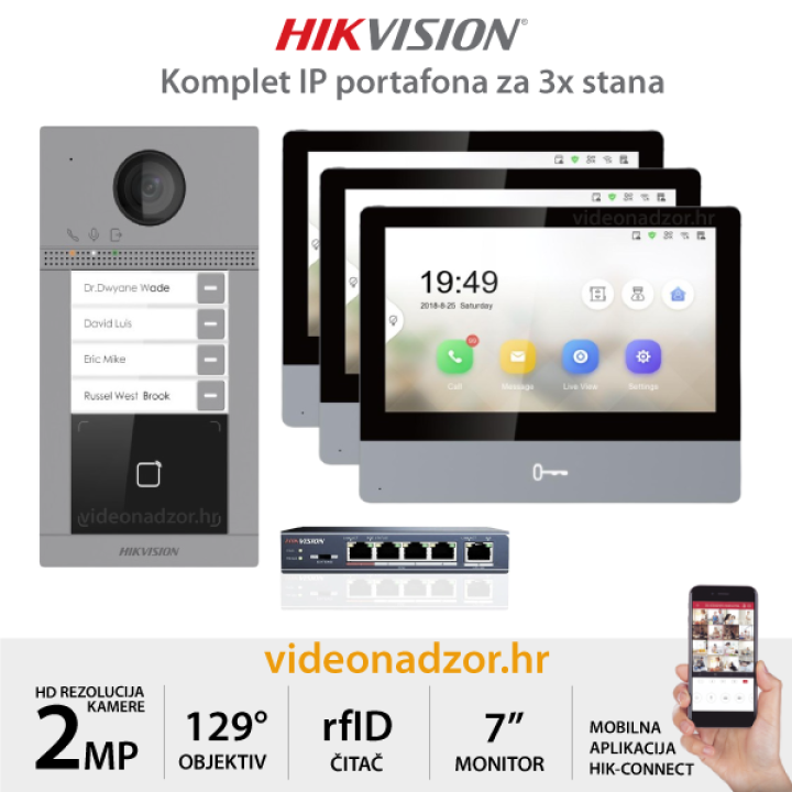 Hikvision komplet IP portafona dolazi sa vanjskom pozivnom jedinicom, ultra tankim IPS monitorima veličine 7" te POE switchem. Prednost IP portafona je mogućnost povezivanje sustava na internet te prosljeđivanje video poziva na mobilnu aplikaciju.
